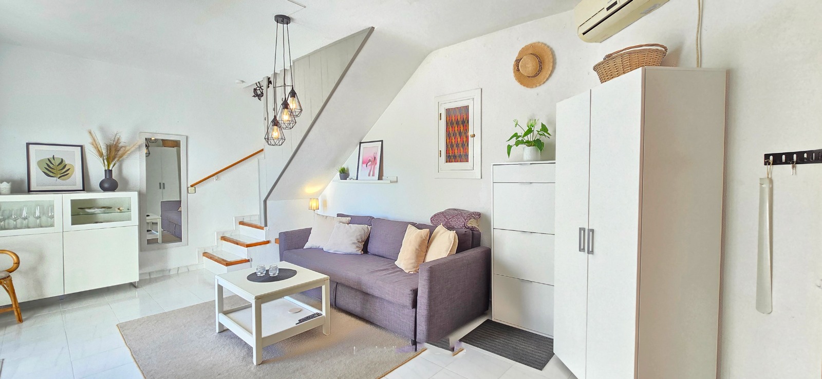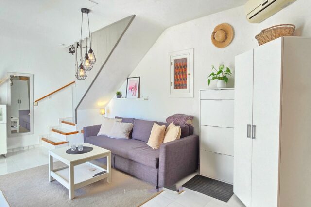 The property offers two bedrooms, one bathroom, a bright and cozy living room, and a modern kitchen with open space. Numerous outdoor spaces, including a two-story terrace, a sunny balcony and a private solarium, add to its appeal. Breathtaking views of the Mediterranean create a seamless connection between sky and sea.