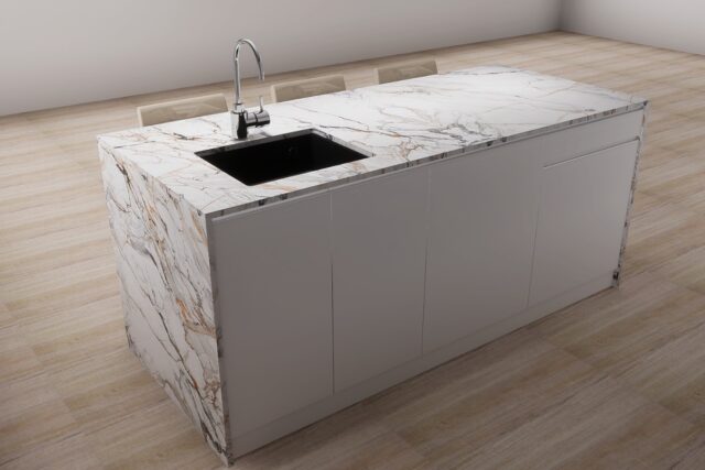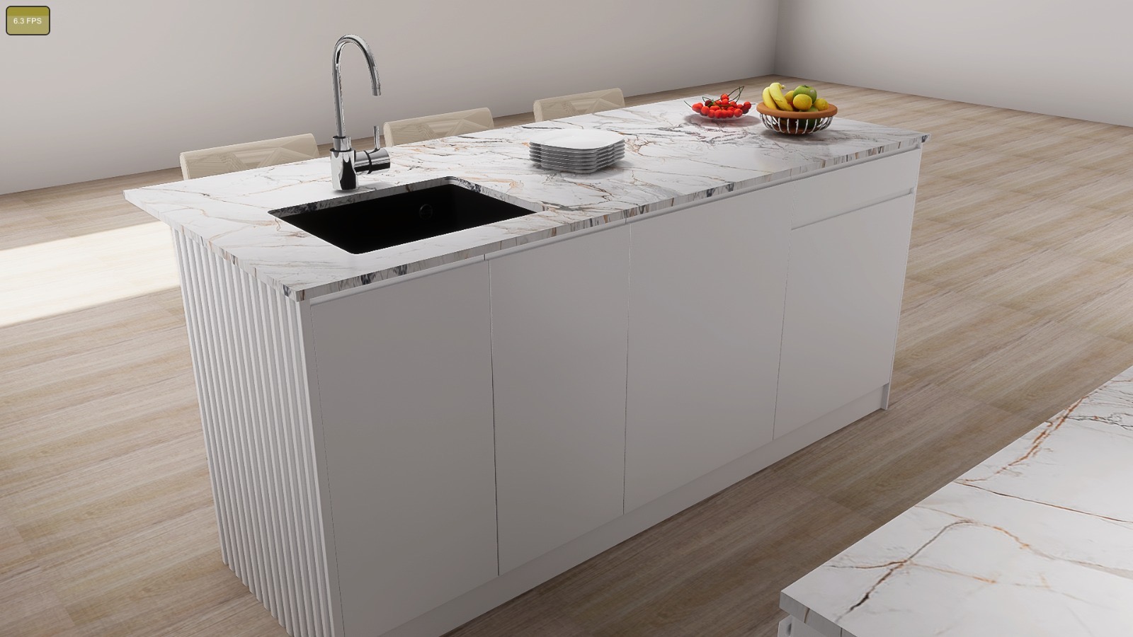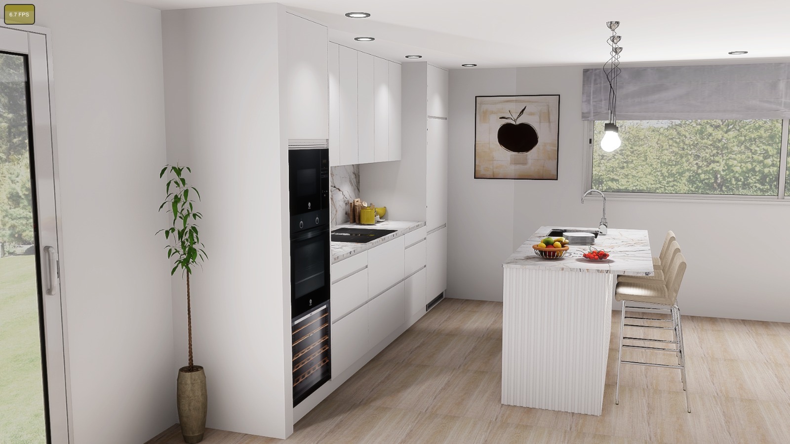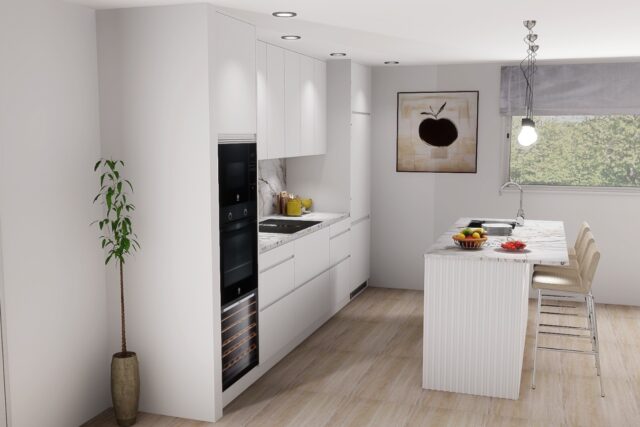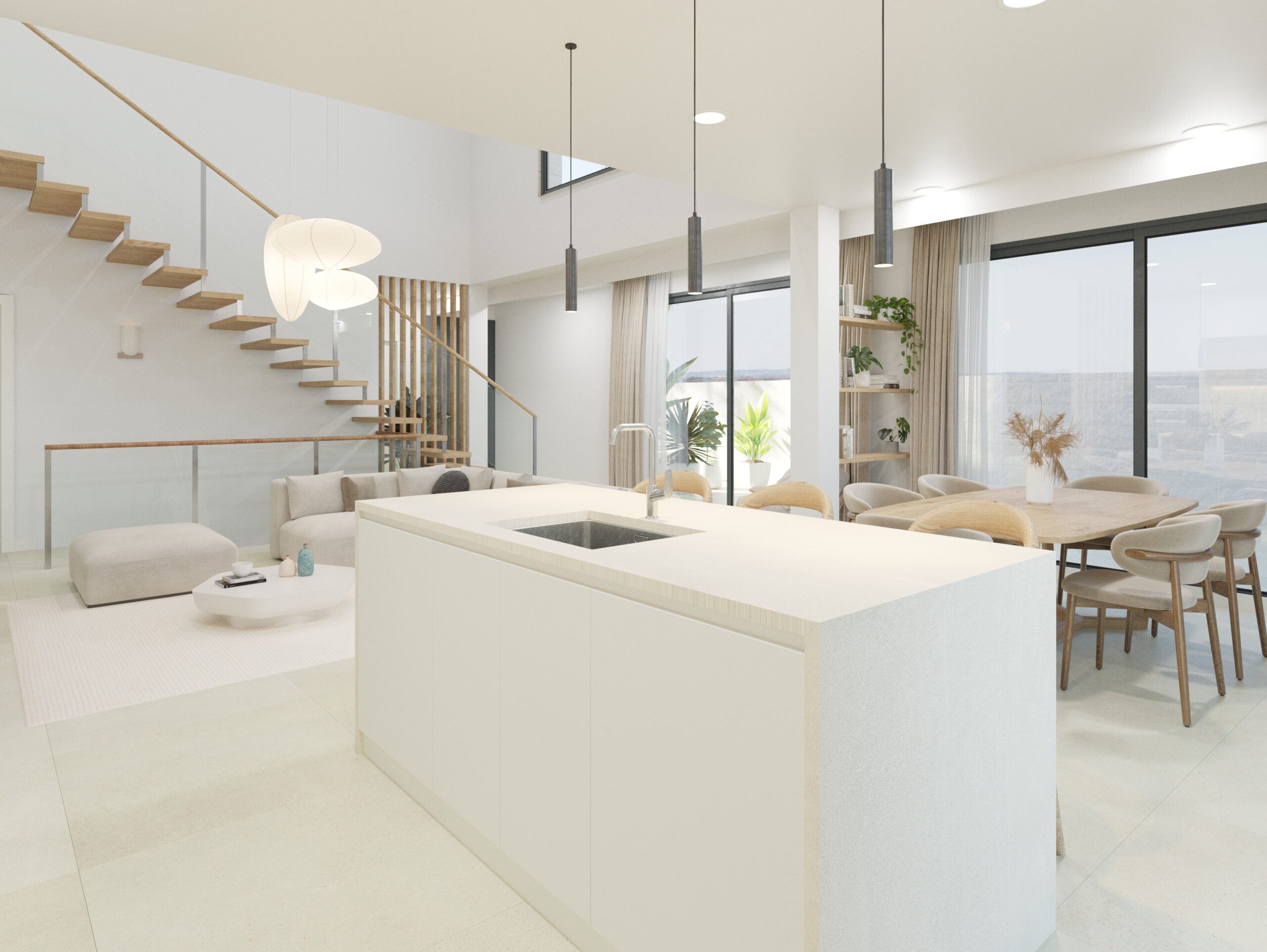 Parter z salonem o podwójnej wysokości, otwartą kuchnią z wyspą, jedną sypialnią i łazienką.